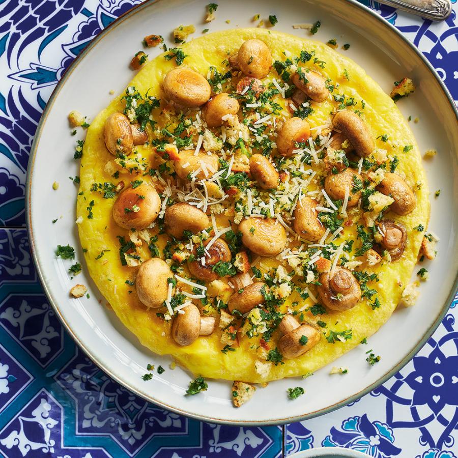 2 eggs, parsley, chives, garlic, sliced mushrooms