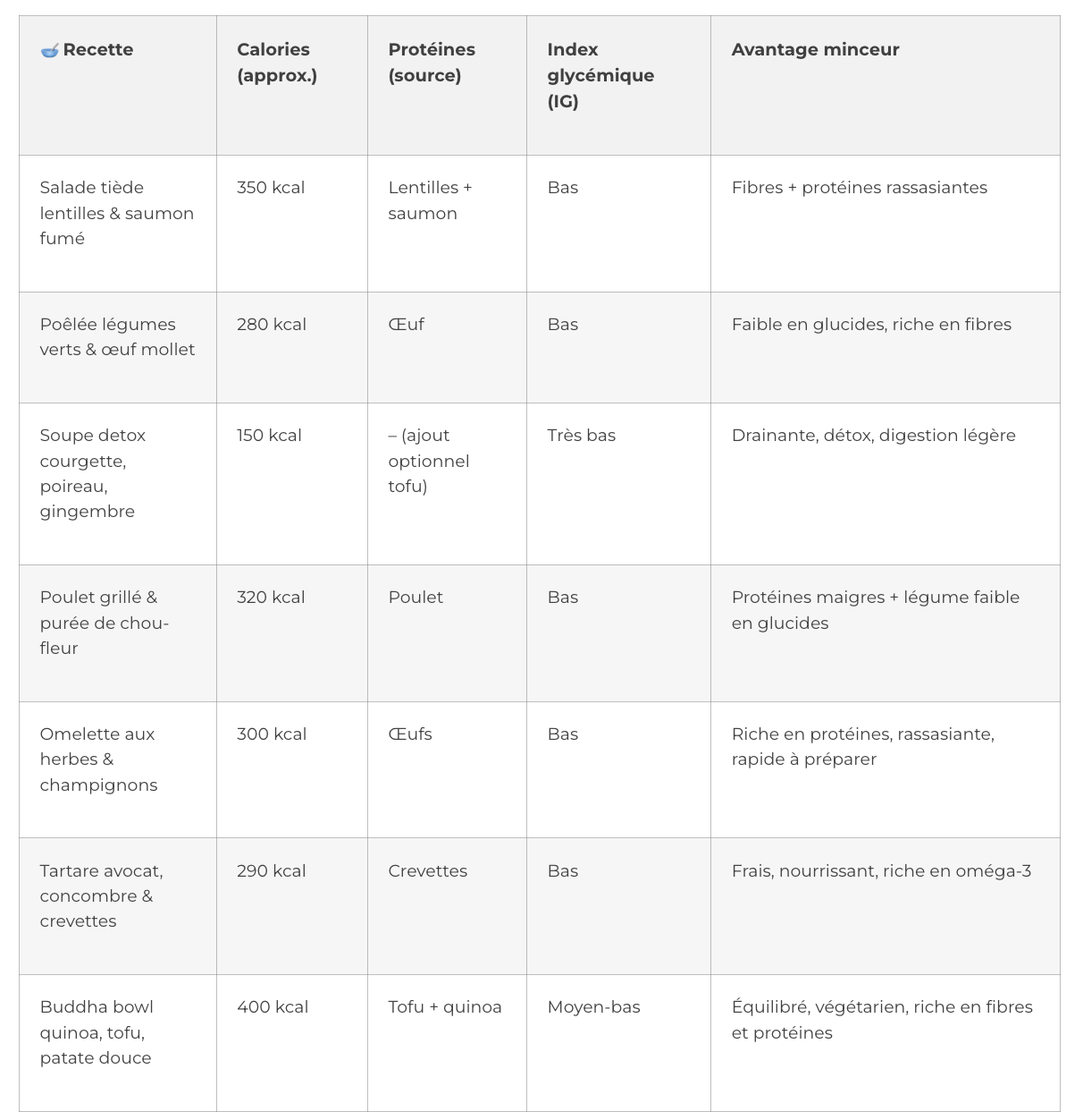 Choosing foods with a low glycemic index is the key to a successful slimming dinner. As a reminder, the glycemic index, or GI, corresponds to the speed at which a food causes a rise in blood sugar levels. Unfortunately, when blood sugar levels rise rapidly, the body secretes a hormone called insulin, which encourages fat storage… Hence the importance of choosing foods with a low GI (between 35 and 50), or even very low GI (below 20) for your evening slimming menu.