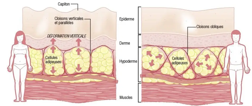 In women, the collagen partitions under the skin are vertical and the skin is naturally thinner. As a result, when they are swollen, the fat cells press towards the surface, while the collagen fibers try to pull the skin downwards to compensate. Hence the appearance of “bumps” of sorts: given the thinness of the skin, dimples are quickly visible, alas;